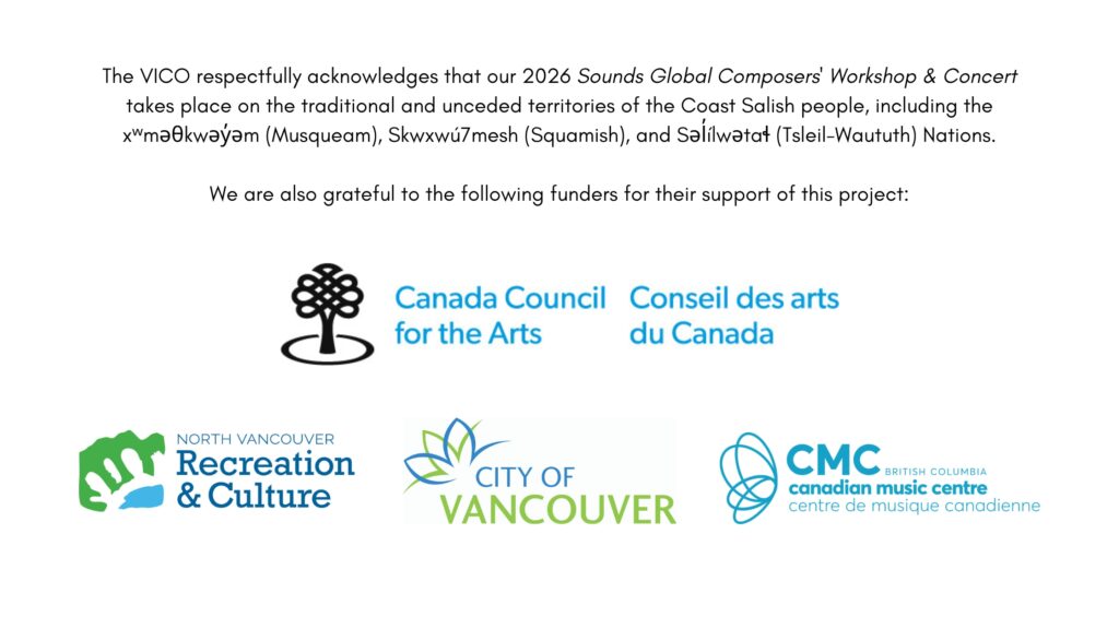 The fee of $200 CAD includes all workshop sessions on the dates listed above, and a professional demo recording of the composer’s piece performed by VICO musicians. NOTE: Composers who do not wish to workshop a piece are welcome to audit any of the above sessions free of charge.